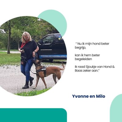 “Onze hond Milo, een Mechelaar van 1 jaar oud, is een pittige hond. Dat wisten we al, maar toen hij tegen mijn man en zoon begon te grommen en zelfs dreigde aan te vallen, moesten we wel hulp gaan zoeken. Dat vonden we bij lieve Hond en Baas. Ik mailde met een soort noodkreet en de volgende dag hadden we al een afspraak! Dat was echt heel fijn, zo snel. Met veel geduld, maar ook met de nodige humor heeft Sjoukje ons inzicht gegeven om beter met Milo om te gaan en het werkt! Vooral onze zoon leerde dat deze hond moet werken in plaats van knuffelen en het gaat nu een stuk beter. We zijn er nog niet, maar wat hebben we al veel bereikt! Het speuren in het bos was ook heel tof om te doen, daar gaan we zeker mee door. Een aanrader voor iedere hondeneigenaar”.